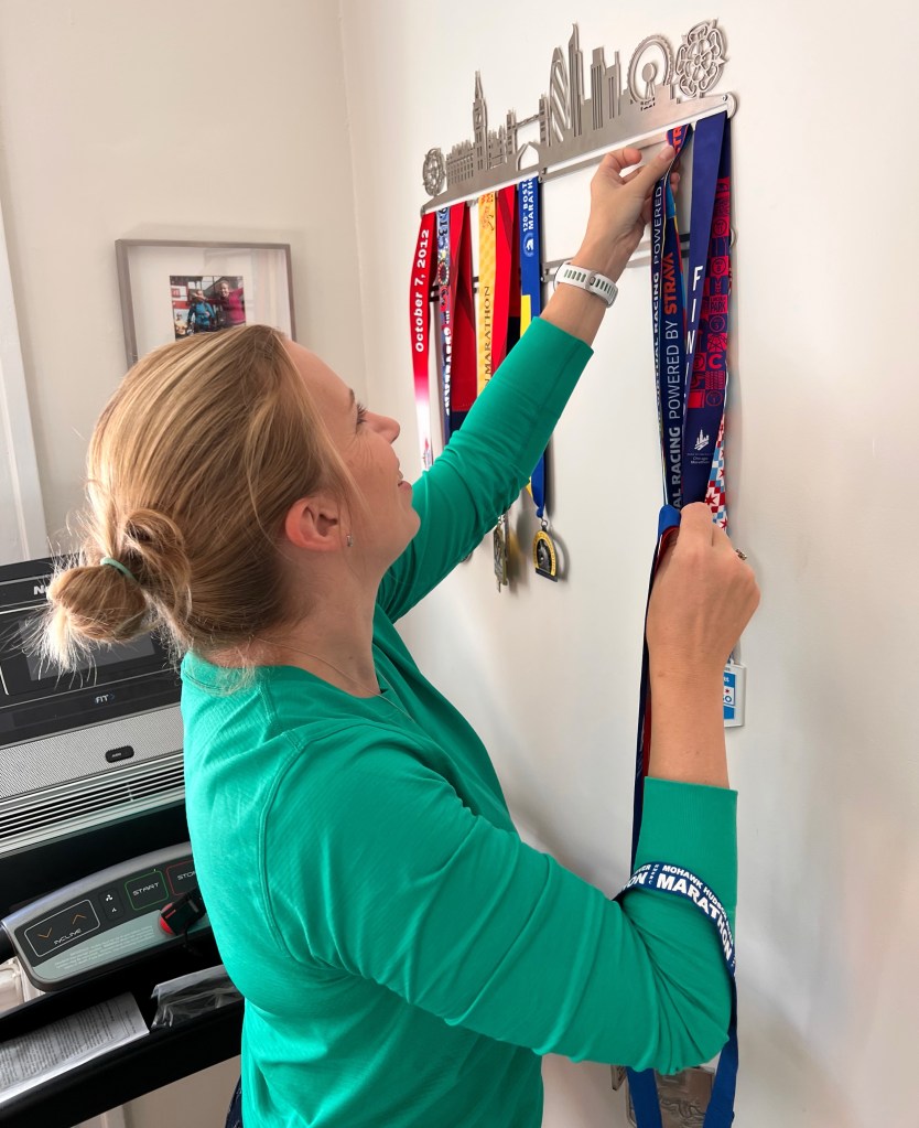 Ultimately, whether you should display your race medals is a matter of personal preference. I have decided to hang mine in a little corner of our guest bedroom where our treadmill lives. A few years ago, I bought the prettiest medal hanger from an artist on Etsy, and I still love it. It gives me a lot of joy to look at the medals and remember all the races and training cycles leading up to them.