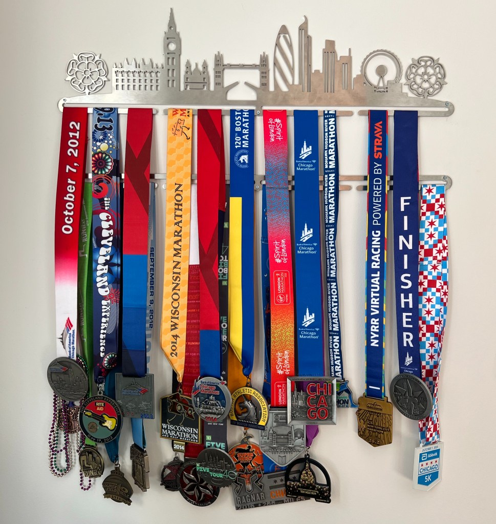 If truth be told, up until this year, I hadn’t run a race in so long that looking at the medals wasn’t making me feel good. It was reminding me of the accomplishments I’d had and all the things I wasn’t doing. Two weeks ago, though, I ran the Chicago marathon, and even though it was my slowest race ever, it was one of the happiest. I’ve found myself looking at the medal and thinking that it doesn’t represent just one race. It represents all the hard training, dedication, the hot summer runs in DC, and then race day when I ran a joyful 26.2 miles around my favorite city in the world and got to see my husband and friends out on the course.