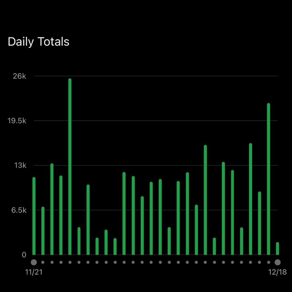 Since the Chicago marathon in October, my running miles have decreased, and so have my daily steps. It hasn’t helped that winter is also upon us, and I have early morning meetings almost every day of the week. My motivation to get outside is at an all-time low – the cold and dark just isn’t appealing. I experienced something similar during the pandemic. When we were all trying to stay at home and socially distance, I picked up bad habits and got into sedentary routines which were hard to change. Sometimes my step count was still under 1000 by noon!