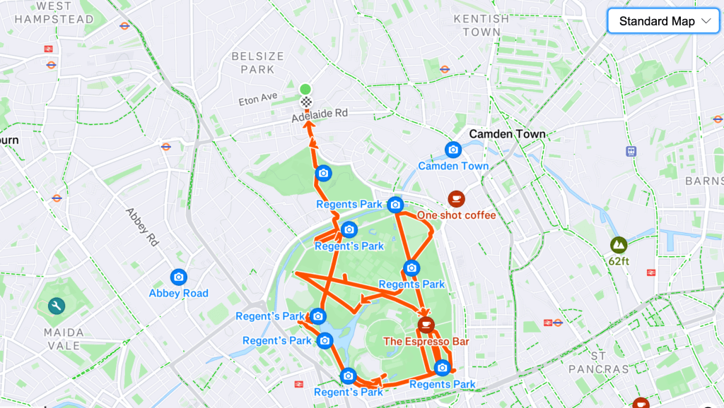 Leaving Primrose Hill, I ran down the hill, and crossed a small footbridge over the Regent’s Canal, which if you have enough time, is another great running route, and entered the heart of Regent’s Park.