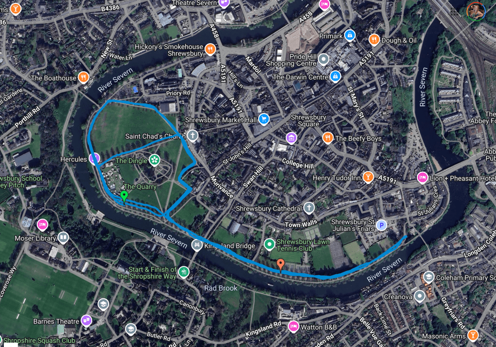 The Quarry is Shrewsbury’s central park, a 29-acre green space dating back to 1719. It’s home to tree-lined avenues, riverside paths, war memorials, and a bandstand, all wrapped around The Dingle — a stunning Victorian sunken garden designed by Percy Thrower. With the River Severn curving around its edge and views across to the town’s historic rooftops, it’s a beautiful place for a run. I must’ve walked through the park thousands of times throughout my life, and as a child often played on the swings in the playground, or sat in the Boathouse pub garden with my parents.