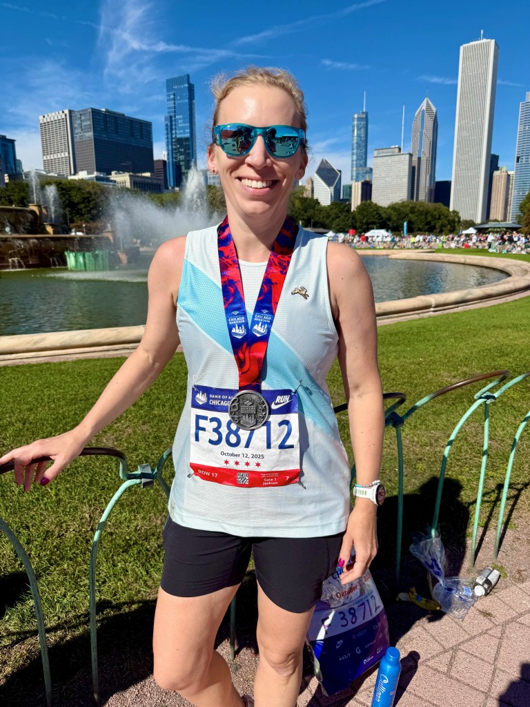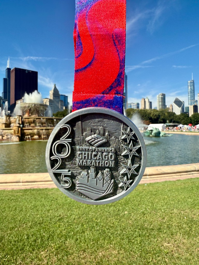 Crossing the Chicago Marathon finish line will always feel incredible to me, and this year was no exception. I collected my beautiful medal, grabbed a heat sheet, apple, and granola bar, and made my way to gear check. The medical and support teams in the finish chute were, as always, wonderfully kind and attentive, helping so many exhausted runners with genuine care.