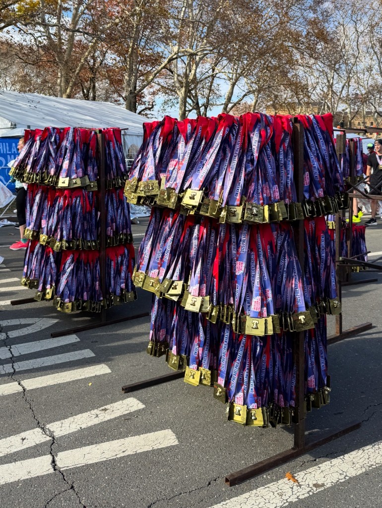 If there’s one aspect of the race I’d change, it’s the start-line security. It looked so organised but upon entering, I learned that they were inconsistent: some runners were allowed to bring Gatorade bottles, while others, like me, were stopped. Having trekked over early, I was disappointed to have to drink half my bottle on the spot and discard the rest. I’d also decided not to check a bag, which turned out to be a wise call, given how long the bag-check lines were and how chaotic things seemed likely to be at the finish. On top of that, the port-a-potty lines were horrendous – even worse than at the Chicago Marathon, which I didn’t think was possible. I ended up waiting for 30 mins and then skipping the bathrooms and heading straight to the corral as I didn’t want to be late.