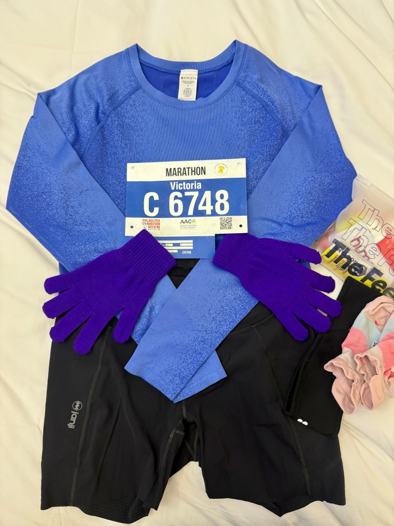 Race day began very early as the start time for the AACR Philadelphia Marathon was 7:00 a.m. (The Philadelphia Marathon) I was awake by 5:30am and took thirty minutes to get ready and prepare breakfast. Because November mornings in Philly tend to be brisk (this one was absolutely freezing), I wore throwaway sweat pants and a fleecy top for the walk over – a decision I was very glad of. If you can’t make it to a goodwill for your throwaway outfit, the sale section in TJ Maxx works well!